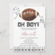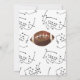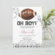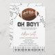 Mostly black and white football themed baby shower invitation featuring a large football, sidelines and football plays.