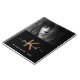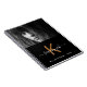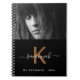 A chic black background. Personalise and add your own photo, a name, monogram letter and a year. The name is written in white with a large modern hand lettered style script with swashes. Golden monogram letter. For school, work, diary and journalling. To keep the swashes only delete the sample name, leave the spaces or emoji's in front and after the name