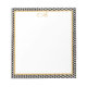 Trendy and chic black and white polka dots and gold framed notepad with a customised first name or last name monogram in gold on the top portion of the notepad with white sheets.