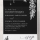 Elegant all in one wedding invitation in black and white with hand-drawn line art of greenery in bold strokes, an elegant and simple monogram with an arrow-pointed divider, and contrasting colours in black and white.