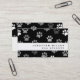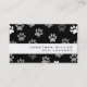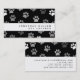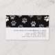 Professional animal themed business card features a modern paw print pattern with white, charcoal and light grey paw prints on a black background. Custom name and title or role presented on a white banner in the lower thirds, right justified with stylish modern text. The back of the card is complimentary to the front with email address and contact information presented in coordinating typography.