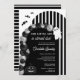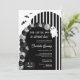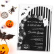 Adorable cute gender neutral Little boo Halloween illustrations baby shower party invitation with a black and white stripes theme, arch , balloons, white ghosts and black pumpkin, with black cute bats with black arch.