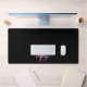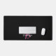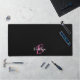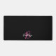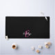 This personalised desk mat features a monogram and first name in modern hot pink and white script on a black background.