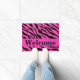 Welcome visitors to your home with this wild splash of colour of bright hot pink fushia and black zebra skin pattern door mat. This door mat is customised with the word Welcome that you can change to another word or name. A bright or hot pink fuchsia strip gives an area for personalisation. Enjoy this popular and contemporary design that will add a trendy and colourful home decorative accent. This design is available in several colour combinations in this store.