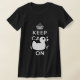 Black and White Rubber Duck Keep Calm and Carry On graphic on a black t-shirt. A British war-time slogan with a humourous twist by artist Elke Clarke. Great conversation starter and fun motivational gift. Elke Clarke© for MovieFun
