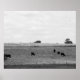 Black & White Landscape of Cows Grazing in a Field Poster