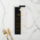 This elegant menu, recommended for a wedding, is half white marble half black. In the upper part, there is a monogram from 2 calligraphic initials inside a faux gold square frame, uniting the two halves. The initials, the title "Menu" and the subtitles are written in a golden elegant calligraphic script, the content in smaller golden letters.