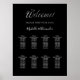 A classic black background. Personalise and add the name of the bride and groom, add your guests names. White text.