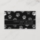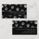 Professional animal themed business card features a stylish paw print pattern with white, charcoal and light grey paw prints on a black background. Custom name and title or role presented on a black banner in the lower thirds, right justified with stylish modern text. The back of the card is complimentary to the front with email address and contact information presented in coordinating typography.
