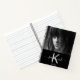A chic black background. Personalise and add your own photo, a name, monogram letter and a year. The name is written in white with a large modern hand lettered style script with swashes. The monogram letter in grey. For school, work, as a diary and for journalling.
