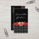 Black white polka dot pattern with red bow and jewel business card template that features a black and white pattern with dots and a red ribbon across it with a bow and a heart shaped jewel also in red with gold outline and strass which adds a little bling. Note the bow and the heart diamond jewellery is a "printed on" illustration and not a real crystal, so are the strass. An elegant and stylish feminine business card design. Trendy, fashionable and modern perfect for professional or personal use.
