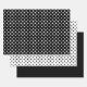 These wrapping paper sheet features one sheet that is black with white polka dots, one sheet that is white with black polka dots and one sheet that is all black.