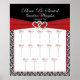 This custom black and white damask pattern wedding reception seating assignment poster has a red PRINTED ribbon with a pair of PRINTED red FAUX glitter and diamond jewel joined hearts on it that matches the wedding invitation shown below. It is personalised with the name of the bride and groom and their wedding date. It is set up to be used by table order with 14 tables of 10, but you can change the text and lay-out to however you choose. If you need assistance, please email niteowlstudio@gmail.com for help.