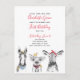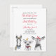 Your little one is turning one! Invite your special guests with this adorable invitation postcard featuring hand drawn farm animals (a horse, a pig, a cow and a chick) in black and white. Baby's name, "first birthday" and the date are in red hand lettered script typography, and personalised in a chic modern black sans serif. Copyright Elegant Invites, all rights reserved.