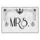 You can personalise all the text on this black and white art deco style roaring 20s (twenties, 1920's) glamourous and ritzy personalised affordable wedding Mrs. card. You are meant to place this on the back of the bride's chair. Usually it is hung with ribbon or fabric. The design features a black art deco frame on white background with a floral damask style pattern overlay in the back. There is a Mr. card to go with it for the groom.