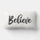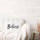 Believe Handwriting | Holiday Throw Pillow with black and white buffalo plaid pattern on the back. Modern farmhouse typography design by Blackberry Boulevard "Believe" written in a black script font on a solid white colour background. Other colours available in store. Perfect accent pillow for your holiday home decor.