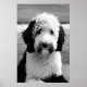 This stunning black and white photograph captures the essence of a majestic sheepadoodle at the ocean. The wind is blowing through its soft, curly fur, and you can almost feel the salty breeze coming off the water. This print would make a beautiful addition to any home or office, adding a touch of nature's beauty to any space.