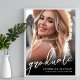This simple and minimalist graduation party sign features a full-page photo with a black gradient at the bottom, overlaid with white text for a sleek and modern look. "Graduate" is displayed in elegant handwritten script, with the graduate’s name, "Class of 2025," and the school name below in classic white fonts, ensuring a bold and readable design.