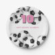 These cute soccer themed birthday party paper plates are fully customisable and feature clusters of black and white soccer balls at the top and bottom edges - personalise with your custom text - by katz_d_zynes
