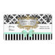 A design with a black and white damask pattern paired with a black and white striped pattern.  It's embellished with a mint satin look bow ribbon.