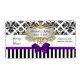 A design with a black and white damask pattern paired with a black and white striped pattern. It's embellished with a purple satin look bow ribbon.