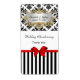 A design with a black and white damask pattern paired with a black and white striped pattern. It's embellished with a red satin look bow ribbon.