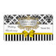 A design with a black and white damask pattern paired with a black and white striped pattern. It's embellished with a bright yellow satin look bow ribbon.