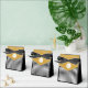 In contrast, the upper part of the front presents a bold and eye-catching mustard yellow shade, adorned with a regal gold font on a striking monogram initial in uppercase adorns a round white shape, complemented by a customisable ribbon available in white, black, pink, or purple, tailored to suit each client's preference.