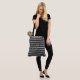 This tote bag is shown with a fun black and white striped print design. Large size shown. Has Black straps.