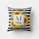 This modern personalised pillow features a watercolor sunflower and foliage floral design with black and white stripes and faux gold monogram. Personalise it with your name and initial.