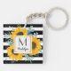 This personalised keychain features a modern watercolor sunflower and foliage design with faux gold and black and white stripes. Personalise the monogram with your name and initial.