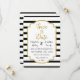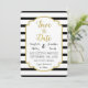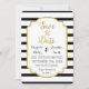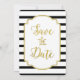 Wedding save the date announcement card with classic black and white stripes pattern and vintage gold details. Customisable with your wedding details, available in a wide range of matching wedding products. Contact us to request a colour change or a custom product.
