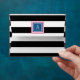 Striped RSVP envelope in black and white with a pink lining personalised with your address. The back is decorated with a monogram in matching pink and blue.