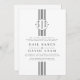 Black white stripes and monogram wedding invitation. It displays vertical stripes in the centre with a circle with your initials and two little hearts and your text. The back includes a black and white striped pattern.