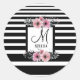 Black & White Stripes Pink Floral Monogram Classic Round Sticker