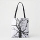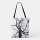 This tote bag features an artistic, black and white abstract pattern of the top of a tulip tree in winter with bare branches in silhouette.