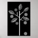Black white tree on black background, featuring an elegant tree with dotted and lined leaves and fruit in B&W minimal style.
