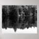 Original black and white photograph of a line of trees along the river's edge reflecting in the calm water printed on a 16x20 poster print. A BohippianFinch original photograph.