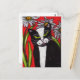 This postcard has a black and white tuxedo cat with green eyes sitting in front of white daisy flowers with green leaves on a vibrant red background.