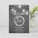 Black White Wedding Save The Date Card with Black Rustic Chalkboard Background, Mason Jars, String Lights, Floral Wreath with Couple Initials, Monogram and hand written text. Use personalise this template option to change the text | Use customise further option to change the text style and colour if required. Also check out our store collections for matching items.