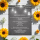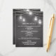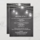 Black White Wedding Details Card with Wedding Details, Accommodation, Information details on a chalkboard background with mason jar and string lights.