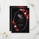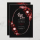 An elegant black wedding save-the-date card featuring a rustic burgundy red floral arrangement on an oval frame.