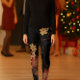 A festive legging to be worn with black or gold. This legging features a gold, white and burgundy poinsettia floral print. A dressy print for parties and beyond.
