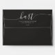 This black return address envelope features an elegant white script surname paired with a refined serif address line, perfectly centred on the flap. The classic black-and-white contrast creates a timeless, sophisticated look ideal for weddings, formal events, holiday cards, or upscale everyday correspondence. Fully customisable with your personal details, this envelope adds a bold and polished finish to any mailing.