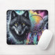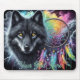 Illustration of a wolf with glowing eyes next to a colourful dreamcatcher, set against an awe-inspiring cosmic backdrop, evoking mystery, spirituality, and a connection to nature and dreams.