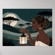 The illustration features a graceful profile portrait set against rolling teal hills, a bright full moon, and silhouetted acacia trees—finished with warm metallic-gold style accents and starry details. A lantern’s soft light becomes the focal point, creating a peaceful “night walk” feeling that works beautifully in bedrooms, reading nooks, living rooms, and cozy entryways.