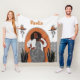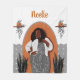 This design features a curvy African American beauty with a white jacket and grey dress on a terracotta coloured wall with plants and white background