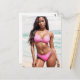 This postcard features a photographic image of a beautiful swimsuit model from the African diaspora. She has long hair and wears a pink bikini as she poses on the beach with the ocean behind her. Her expression is a little sly. Great summer-core aesthetic image for anytime!