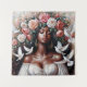 Feminine floral artwork of a beautiful black woman adorned by flowers and surrounded by doves. Her eyes are closed in a serene expression, and she wears a peasant-style dress. The melanin-rich dark brown beauty could be African-American, Afro-Latina, Caribbean, Afro-British, etc. A hyperfeminine flowercore and angelcore aesthetic painting of a gorgeous melanated woman.