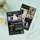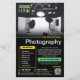 Black marketing flyer for a professional photographer personalised with your photos, logos, contact information, custom text, and QR code. Add your work to this promo flyer for a professional photography business with bright yellow and mint green as accent colours. Add your specialities and offers and current discount promo. On the back, display a sample of your work in a clean photo collage beneath your logo. Professional promotional flyer for your photography business. Vertical photography marketing flyer in black, yellow, and mint for an eye catching look.